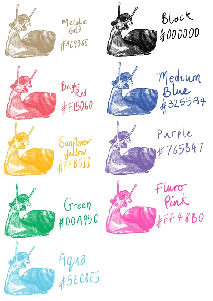 This chart shows the nine different colours we have available, along with their official hex codes. Be warned that the colours won’t look exactly like this in real life because different computer monitors display colour in different ways – there’s no substitute for checking out our colour charts in the shop in real life! These snails are pretty damned magic though…