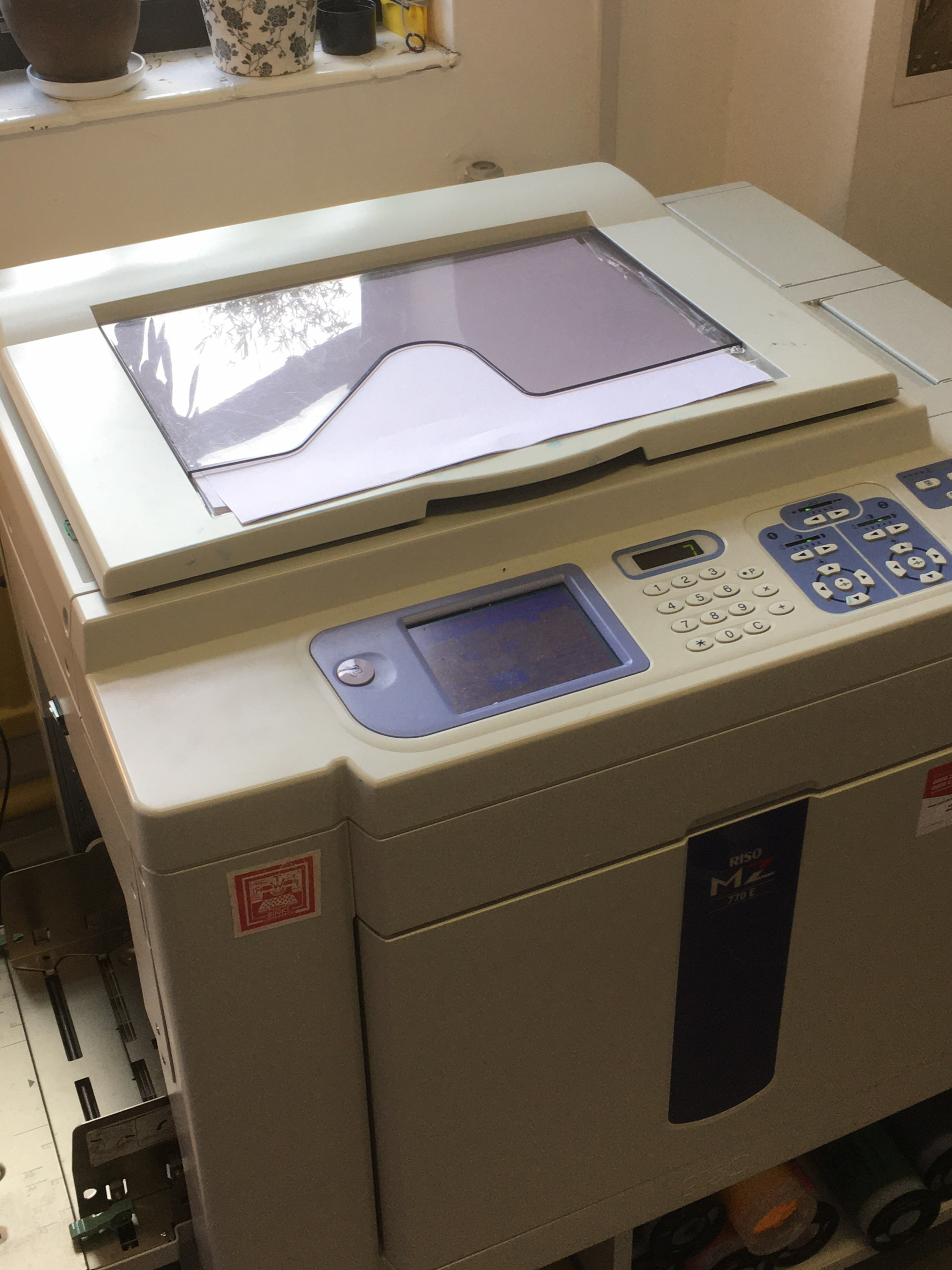 Riso is an electronic screenprinting machine which uses ecologically friendly bran oil based inks to print on uncoated paper. Our machine is called Lyra, and she prints on A3 paper – the wee folding zine we teach in our workshop is made from a single A3 sheet. We can send black and white images in pdf format to the machine and it will cut stencils* and attach them to the ink drums, but for the workshop we’re usually making these images by drawing, using our typewriters to create text which we glue to an original which will then be scanned straight into the machine to make the stencils. We’ve got a light-box so you can draw two black and white layers and line them up (ish!) to add an extra colour. In the workshop you’ll be guided through how the machine works, and we’ll give you tips and tricks for designing for riso ( for instance some things, like big colour blocks, are not necessarily a great idea because of the stickiness of the ink!)