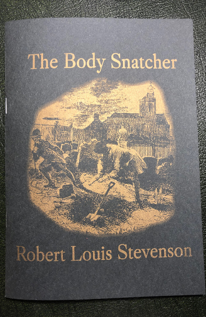 A spooky bit of Edinburgh Gothic from Scotland’s best storyteller – body snatching & murder – dark dreich nights and dark deeds! 32 page a5 stapled booklet risograph printed  in purple on Cairn Straw Cream paper with a Context Slate cover risograph printed in metallic gold with contemporaneous illustration. Published & Printed by Typewronger Books 2024.