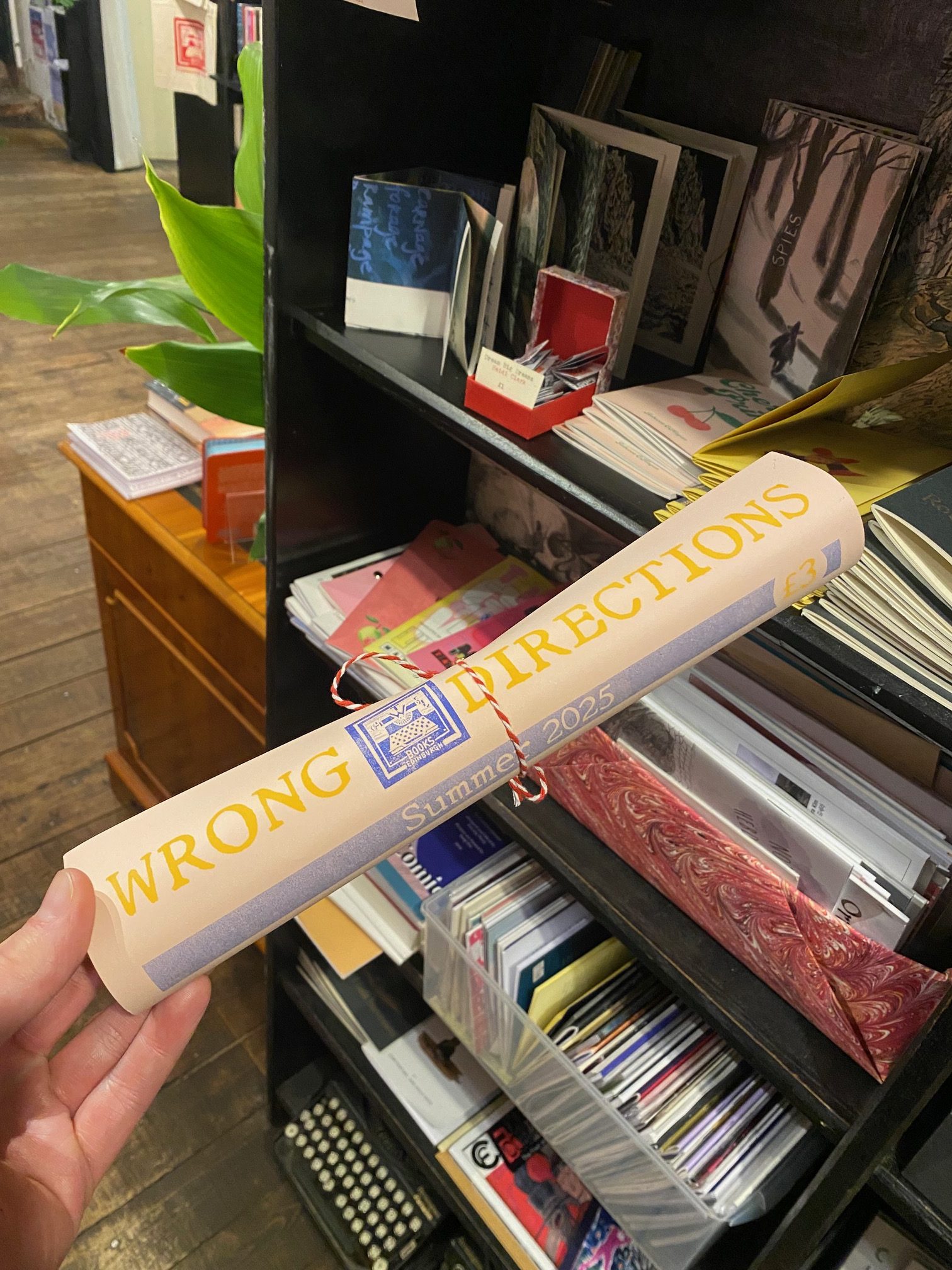 Wrong Directions is our quarterly poetry and flash fiction zine. A single A3 risograph printed sheet, it is sold in store as a scroll, but can be folded into its own envelope so you can send your copy to a friend when you’re finished reading it – or we can post it out to you if you buy it on the website!